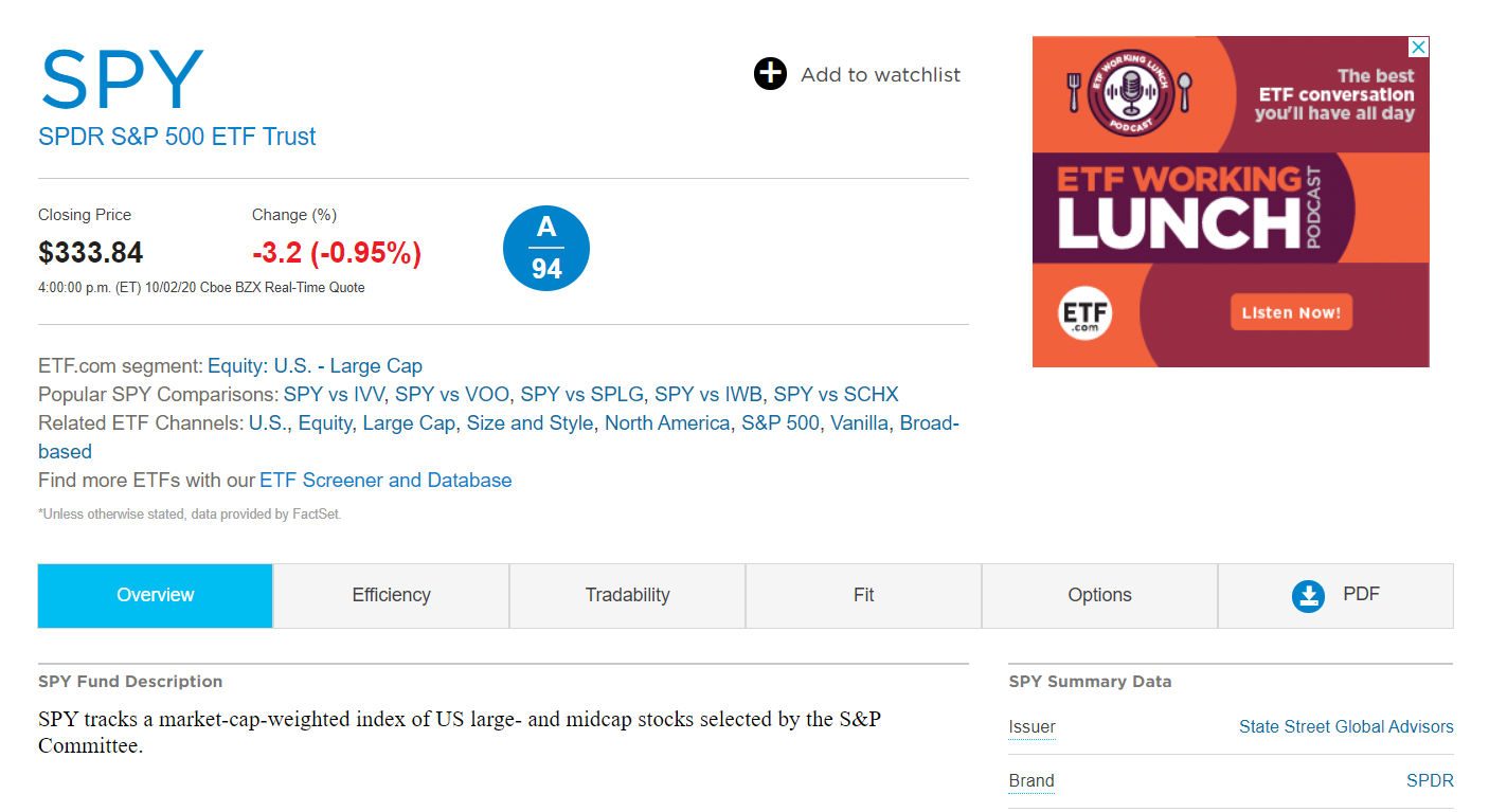 위에서부터 화면 구성을 설명드리면, SPY는 티커(Ticker)이고, 그 아래 SPDR S&P 500 ETF Trust는 ETF 이름입니다. 그 아래 종가(Closing prices)와 가격변화율(Changes(%))이 표시되고, 옆에 A/94가 있는데 "A"는 MSCI EGS RATINGS에서 평가한 ETF등급이고, "94"는 etf.com 이 분석한 점수입니다.
