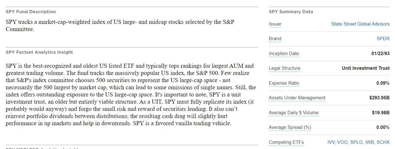 사진 속의 SPY ETF는 S&P 500에 상장된 주식에 투자를 합니다. 그리고 이 ETF의 "Segmetn Benchmark" 지수는 "MSCI USA Large Cap Index"로 입니다. 그래서 그래프 아래 표로 정리되어 있습니다.