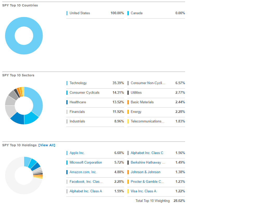 다음 화면은 해당 ETF가 어디에 투자를 하고 있는지 알 수 있는 화면입니다. 내용 국가별, 섹터별, 그리고 가장 많이 보유하고 있는 주식 10개를 보여주고 이 10개의 주식이 전체 ETF에서 차지하는 비율(Total Top Weighting)도 알 수 있습니다.