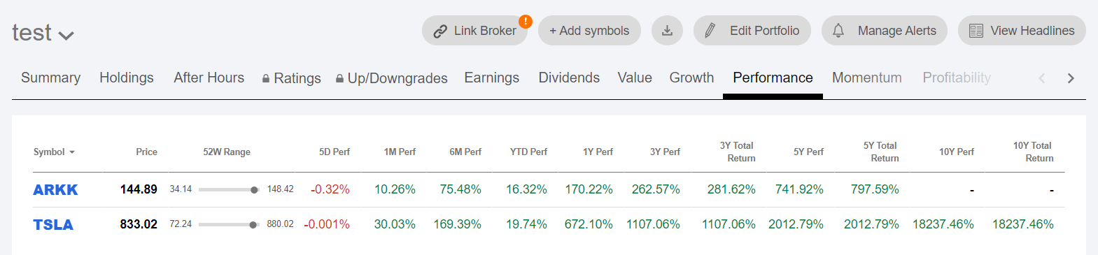 포트폴리오 추가된 종목은 위에 메뉴에 따라 원하는 부분을 비교해서 확인할 수 있습니다. 위 화면은 성과 부분인데 수익률을 뜻 합니다. 여기서 Total Return은 주가 수익률에 배 당수 익까 모두 포함한 것을 뜻합니다. 이렇게 보니 10년 전 아니 5년 전이라도 테슬라 주식에 전 재산을 투자했으면 지금 어땠을까라는 생각이 듭니다.