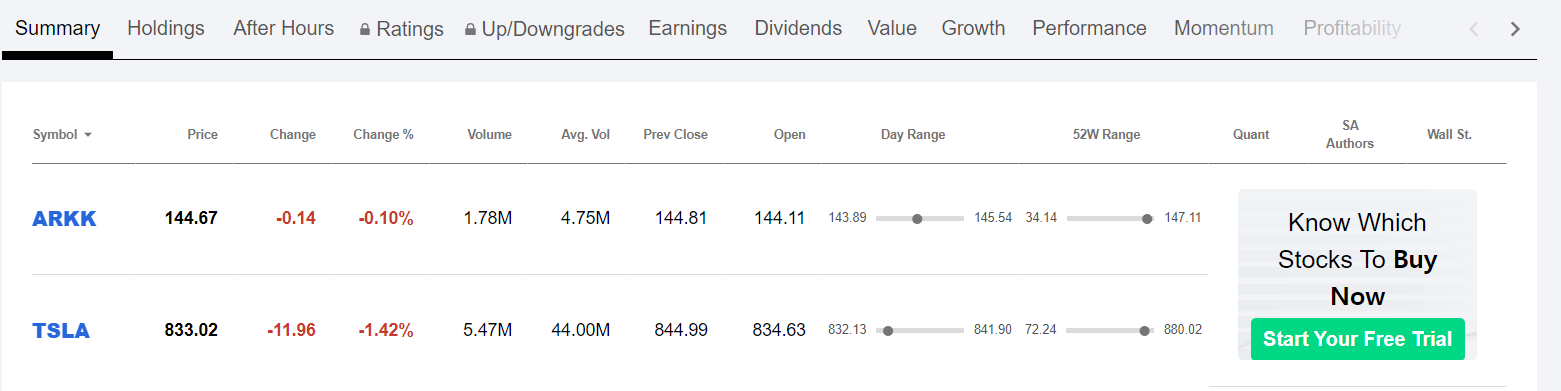 제가 이 화면에서 좋았던 정보는 52W Range입니다. 52주간 주가의 범위, 즉 가장 낮았던 주가와 가장 높았던 주가를 한눈에 알 수 있습니다. 이 정보로 보면 현재 ARKK와 테슬라의 주가는 52주 동안 가장 비싼 가격이라고 확인됩니다. 역시 작년에 가장 핫 했던 종목 받게 최저가와 최고가의 차이가 엄청납니다.