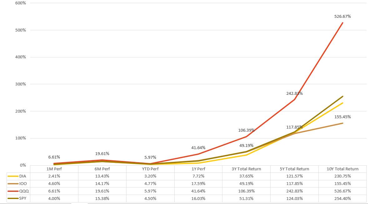 IOO 수익률을 SPY,QQQ,DIA와 비교해보면 10년 토털 수익률에서 먼저 눈에 띄는 것이 앞도적 수익률을 자랑하는 QQQ는 제외하고 IOO가 수익률이 가장 낮은 것을 볼 수 있습니다. 전 세계 100대 기업에 투자를 하지만, 보유기업의 70% 이상이 미국 기업이고 10년간 미국 기업의 주식이 다른 국가에 비해 많이 상승했습니다.