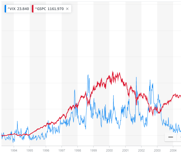 1990년대 VIX 지수와 S&P 500 지수를 비교한 그래프를 확인해도 대부분 VIX지수와 S&P500가 역방향으로 움직이는 것을 알 수 있습니다. 하지만 1996년부터 1998년 부분은 지수를 추세를 보면, VIX지수와 S&P500이 같은 방향으로 움직이는 경우는 것을 알 수 있습니다. 그래서 VIX지수만 무조건 신뢰해서 투자를 하면 위험할 수 있습니다.
