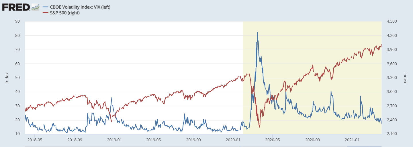 위 그래프를 보시면, 코로나 바이러스가 본격적으로 퍼질 때, 이에 대한 주시시장의 불안감으로 VIX 지수 82.69가 되었고 실제로 주식이 급락하였습니다. 그래서 VIX 지수를 흔히 '공포지수(Fear Index)'라고 불립니다.