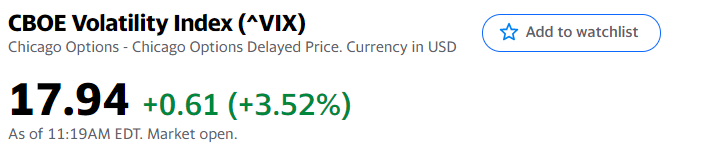우리가 VIX지수라고 부르는데, 여기서 VIX는 CBOE Volatility Index의 티커명입니다. CBOE는 시카고 옵션 거래소이며, 이 거래소에서 거래되는 S&P500 지수 옵션의 변동성(Volatility)을 나타내는 지수입니다. VIX 지수는 1993년 미국 주식시장의 변동성을 나타내기 위해 개발되어, S&P 500 지수 옵션의 30일간의 변동성에 대한 투자 기대 지수를 나타냅니다. 그래서 VIX 17.94(%)이면 앞으로 30일간 주가가 17.94(%)의 등락을 거듭할 것이라고 예상하는 투자자들이 많다는 의미입니다.