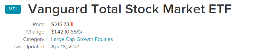VTI는 Vanquard Total Stock Market ETF의 티커명입니다. VTI는 이름에서 알 수 있듯이 Vanquard 사 운용하는 미국 주식장 전체에 투자하는 ETF입니다. etfdb.com에서는 카테고리를 라지캡으로 분류했지만, 라지캡, 미들캡, 스몰캡, 마이크로캡까지 모두 포함합니다. 현재 주당 가격으로 $215.73입니다.