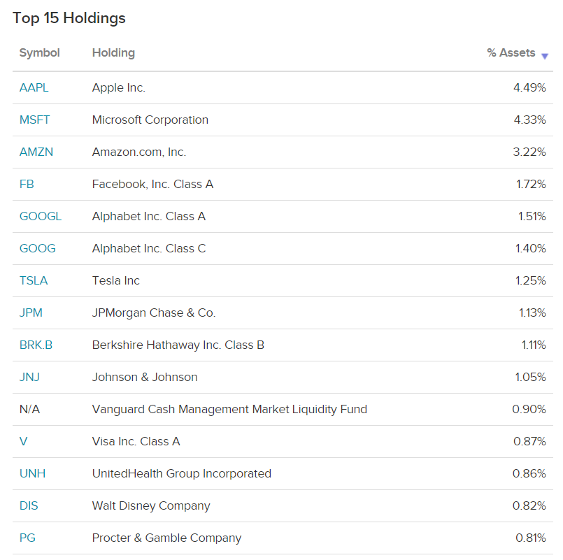 VTI ETF의 보유종목은 미국주식 시장 전체에 투자하고 있어서 모든 미국 기업이 포함되어 있습니다. 위 사진은 가장 보유 비중이 높은 기업 15개입니다. 보시면 유명한 기업이 모두 포함되어 있는 것을 알 수 있습니다.