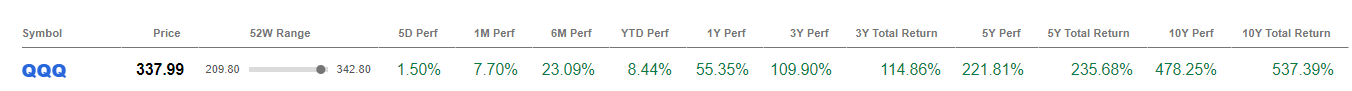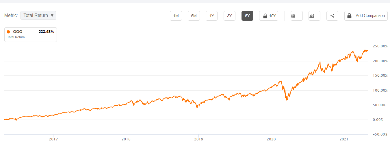 미국 ETF QQQ 수익률을 보면 올해 55% 이상 상승했고 10년간의 누적 수익률이 530% 이상을 거뒀습니다. 과거의 수익률이 미래의 수익률을 대변하진 못하지만, 그동안 좋은 성과를 거둔 ETF라고 알 수 있습니다.