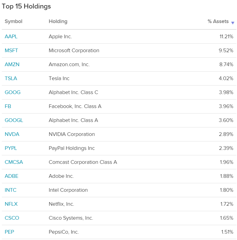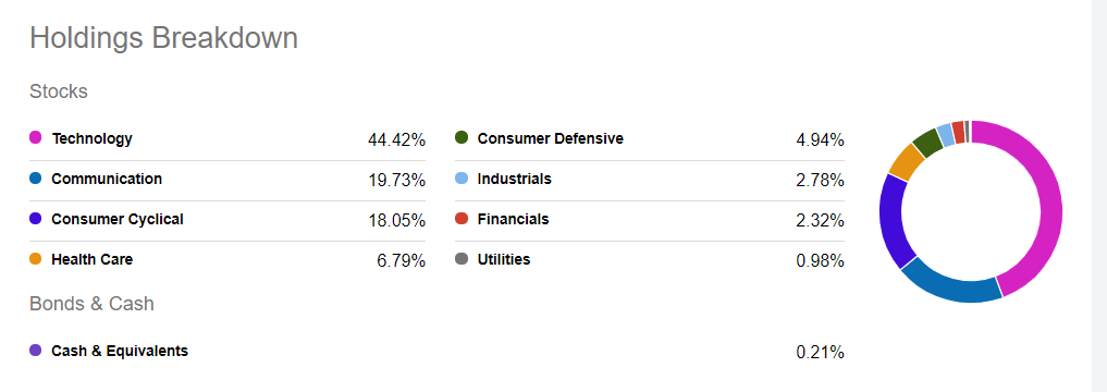 보유 종목의 섹터를 보면 벤치마킹하고 있는 나스닥 인덱스의 섹터와 비슷하게 Technology, Communication, Consumer Cyclical(임의 소비재) 섹터에 속한 주식이 비중이 많습니다.