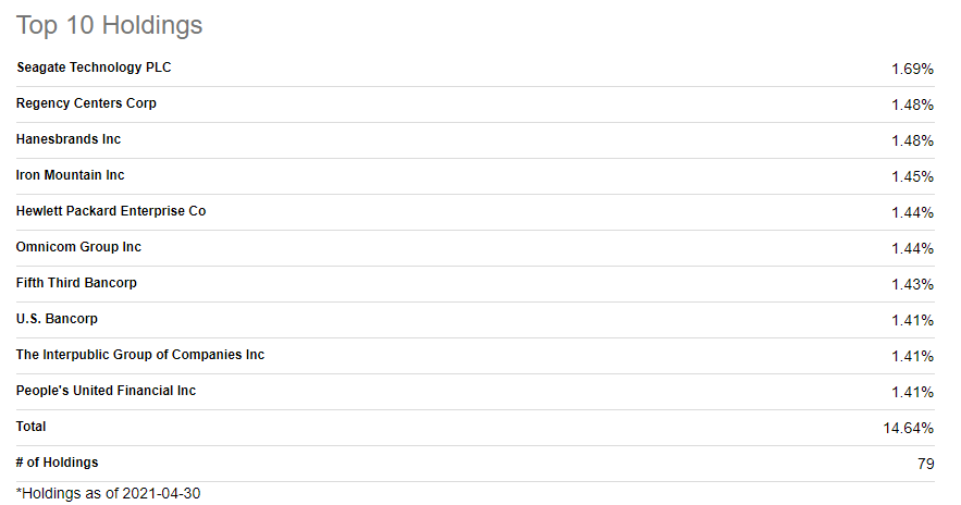SPYD ETF는 추종하는 지수에 포함 된 기업 80개를 통할 비율로 리벨런싱을 합니다. 그래서 상위 보유 종목 10개를 봐서 약 15%입니다. 보유 비율이 조금씩 차이가 나는 것은 리벨런싱 이후 주가가 변동 변동되면서 조정되었습니다.