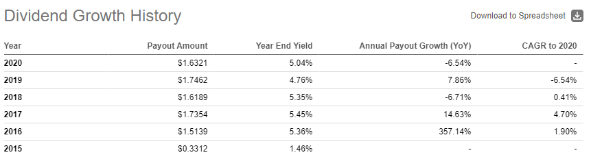 배당 성장률 자료를 보면 ETF가 출시된 2015년을 제외하고 평균 배당률이 5% 넘습니다. 배당 성장률이 일정하지 못하고 들쑥 날쑥하지만, 고 배당률을 유지하고 있습니다.