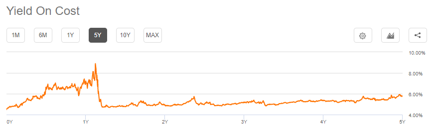 미국 ETF SPYD는 고배당 ETF 답게 직전 배당률이 4.49% 입니다. 하지만 위 그래프를 보시면 이는 지금껏 SPYD ETF 운영되며 배당률에 비하면 낮은 편입니다.