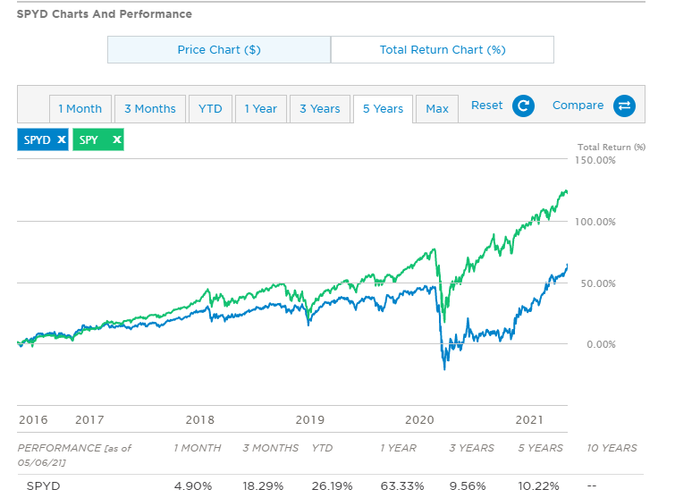 SPYD ETF 경우 2015년에 출시되어 2008년 경제 위기를 겪지 못한 ETF로 경제 위기가 되었을때, 어떻게 될지 몰랐었습니다. 하지만 이번 코로나 19로 증시가 폭락되었을 때, SPY 보다 많이 폭락의 폭이 컸기 때문에 경기 상황을 잘 파악할 필요가 있습니다. 그래도 5년간 연 10% 이상의 수익을 거뒀습니다.