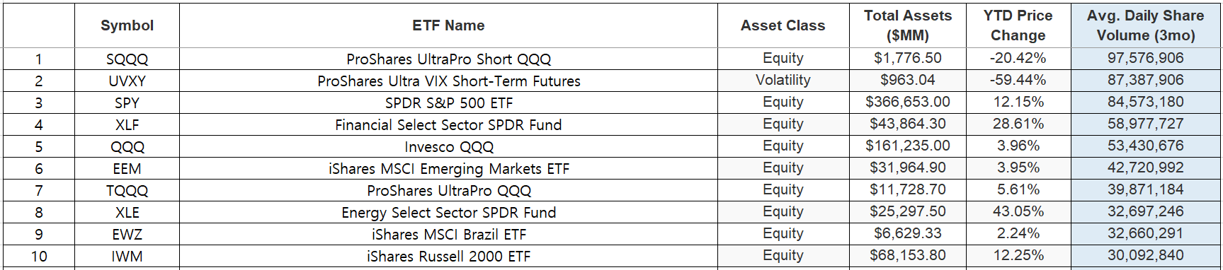 미국 ETF 평균 일일 거래량 순위(1위에서 10위)