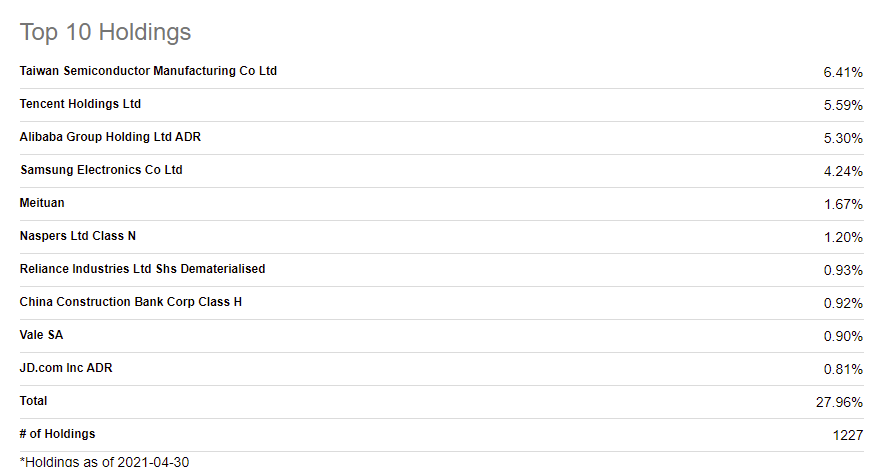 EEM ETF가 보유한 주식 상위 기업 10개를 보면, TSMC, 탄센트, 알리바바, 삼성전자, 내스퍼스(탄센트 최대주주), JD.COM 같은 미국 유명 기업을 제외한 대부분의 유명 기업이 속해 있습니다.