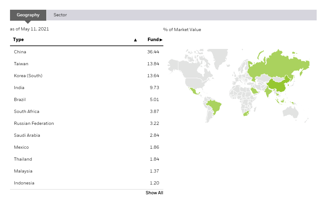 미국 ETF 중에서 신흥국에 투자하는 ETF를 보면 한국이 빠지거나, 중국이 빠지는 등 특정 국가를 제외한 ETF들이 종종 있는데, EEM ETF는 중국, 대만, 한국, 인도, 브라질, 러시아 같은 주요 신흥국이 모두에 포트폴리오를 가지고 있습니다. 그래서 EEM ETF에 투자하면, 주요 신흥국에 투자하는 효과를 얻을 수 있습니다.