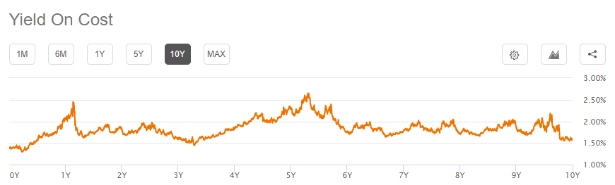 EEM 배당률은 1.38%이고, 일 년에 두 번 배당합니다. 위 그래프를 보면 10년간 배당률이 변동은 있지만 꾸준히 배당된 것을 알 수 있습니다.