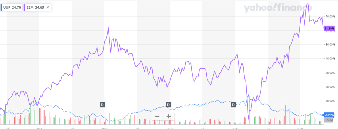 미국 ETF EEM 성과는 올해(YTD) 5.84%, 1년 54.05%, 3년 8.16%,5년 13.10%, 10년 3.40%입니다. 코로나 19 이후로 급격히 상승한 것을 알 수 있습니다. 안전자산인 미국 달러가 약세일 때, 위험자산으로 분류된 신흥국 시장에 투자가 몰리며 강세가 됩니다. 위 그래프는 미국 달러 지수를 추종하는 UUP ETF와 성과를 비교한 것인데, 보면 달러가 강세일때 EEM 주가가 떨어지고 달러가 약세일때 주가가 상승한 것을 알 수 있습니다.