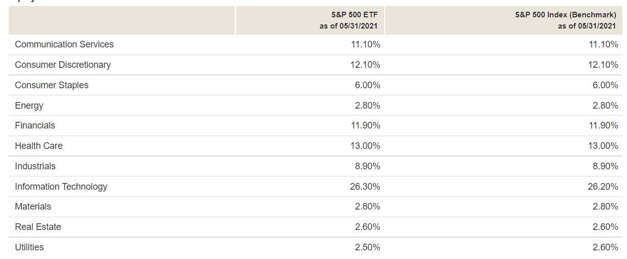 위 표는 S&P 500 지수 투자 섹터와 미국 VOO 투자 섹터를 비교한 것인데, 거의 똑같이 구성되어 있습니다. 주요 보유 섹터로는 IT, Health Care, Consumer Discretionary(임의 소비재), Financials, Communication Services로 이 섹터의 점유율이 약 70%를 넘어 이 섹터에 비중이 높습니다.