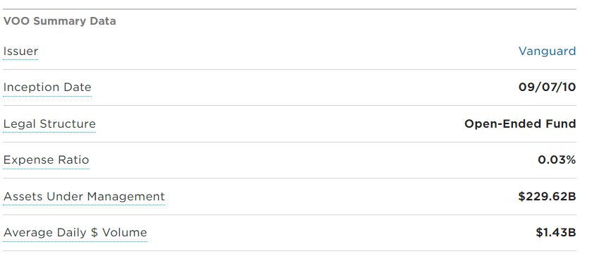 미국 VOO ETF는 2010년 9월에 출시되어 약 10년 정도 운영되고 있으며, 연간 수수료는 0.03%로 저렴한 수준입니다. 앞서서 잠시 언급한 다른 운용사의 ETF인 SPY 보다 약 20년, IVV 보다는 약 10년 정도 늦게 출시되었습니다. 운용자산은 $229.2B로 전체 ETF 중에서 운용자산 순으로 4번째로 많은 ETF입니다. 일일 평균 거래 금액은 $1.43B로 우리 돈 약 1조 6천억입니다.