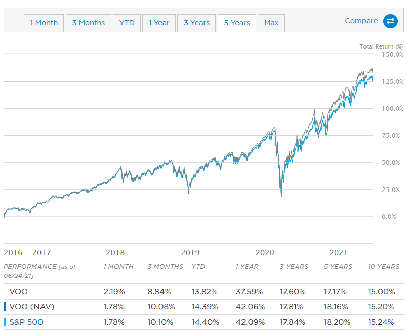 VOO ETF의 성과를 보시면 추종하는 지수인 S&P500의 수익률과 거의 똑같습니다. 위 그래프를 보면 연평균 15%의 성장한 것을 알 수 있습니다. 그리고 2016년부터 약 5년간 누적 수익률이 130% 이상입니다.