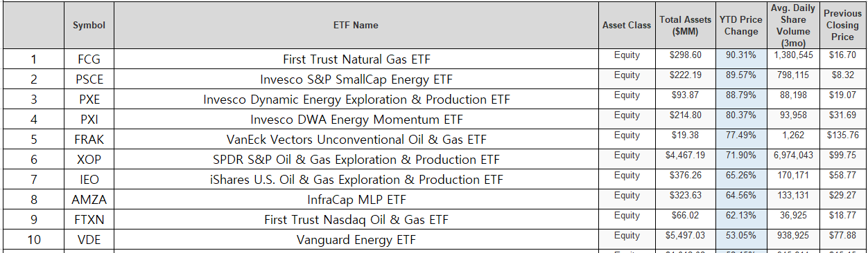 미국 ETF 2021년 상반기 수익률 순위를 정리하고 보니 1위부터 10위까지 모두 에너지 섹터와 관계가 있는 ETF 입니다. 특히 ETF의 이름을 보시면 대부분의 ETF에 석유(Oil), 가스(Gas), 에너지라는 단어가 들어 있습니다. 이들 ETF의 2021년 평균 수익률은 평균 70% 이상 상승했습니다.