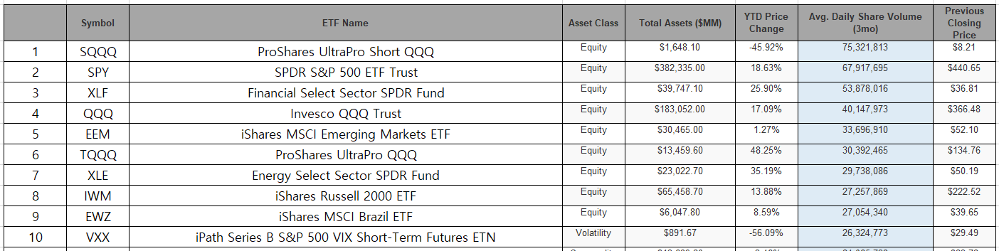 1위는 지난 5월에 조사했을 때와 동일하게 SQQQ입니다. 제가 2개월에 한 번씩 조사 중인데 평균 일일 거래량 순위 1위를 계속 유지하고 있는 ETF입니다. SQQQ는 인버스 ETF로 시장이 하락하게 되면 수익을 얻는 구조입니다. 이름에서 알 수 있는 듯이 SQQQ는 나스닥 100 지수가 하락하게 되면 하락한 비율의 3배를 수익을 얻습니다.