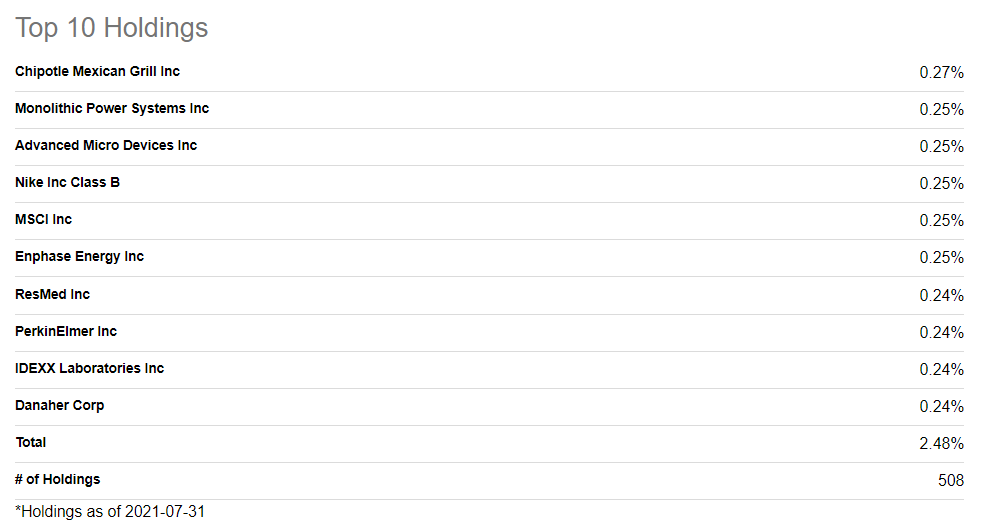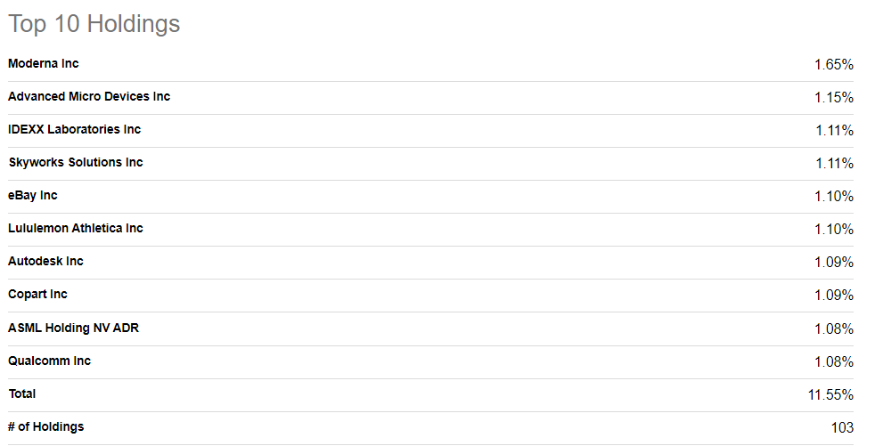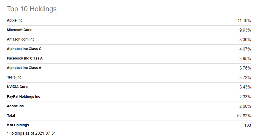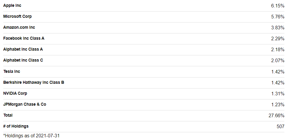 시가 총액 가중 방식 ETF는 말 그대로 시가 총액이 큰 기업에 많은 비중을 투자하는 것입니다. 우리가 알고 있는 QQQ ETF나 SPY ETF가 이 시가 총액 가중 방식 ETF입니다. 그래서 위 사진을 보시면 시가 총액이 큰 기업들의 주식 비중이 많은 것을 알 수 있습니다.