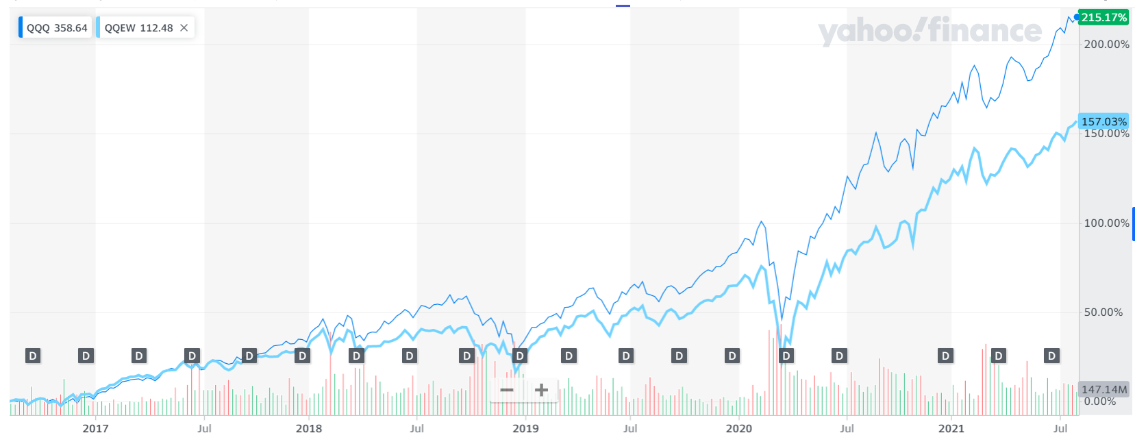QQQ(시가 총액 가중)와 QQEW(동일 가중) 수익률 비교