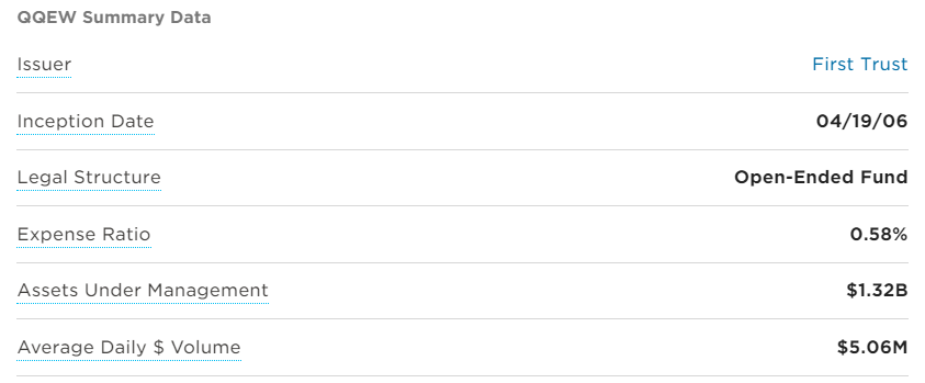 미국 ETF QQEW는 2006년 4월 19일에 출시되었습니다. 수수료는 0.58%로 0.2%인 QQQ보다 비쌉니다. 운용자산 $1.32B, 평균 일일 거래 금액 $5.06M으로 QQQ와는 비교가 안될 정도로 낮은 수준입니다. 그래도 운용 자산 1조 5천억과, 일 거래 금액 약 60억은 작은 수치는 아닙니다.