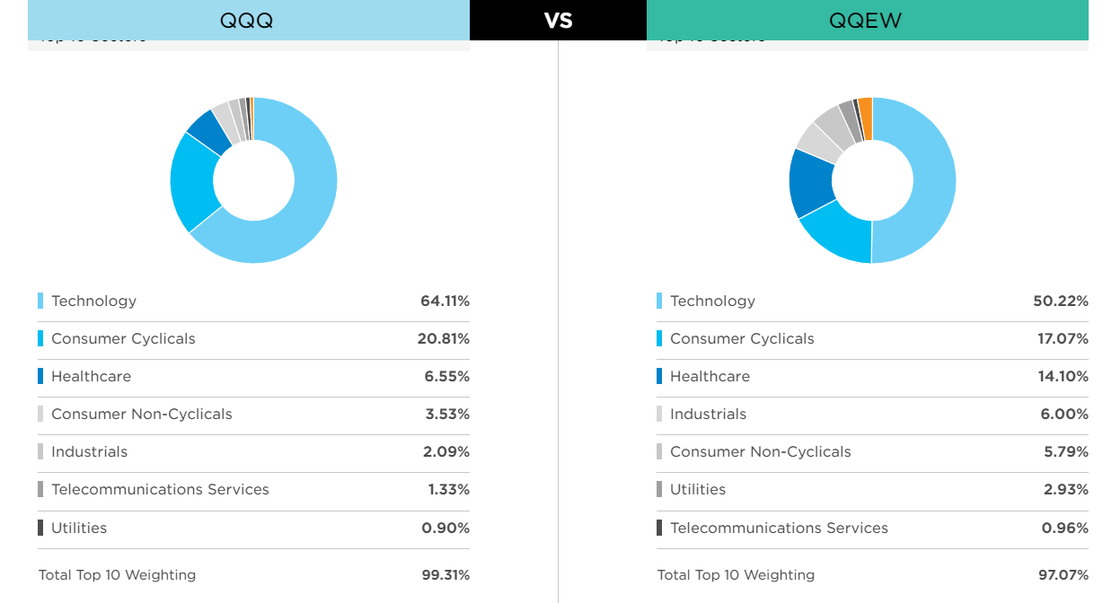 투자 섹터는 QQQ와 비교해서 알아보겠습니다. 두 ETF다 기술 섹터가 50% 이상 되고 있는데, QQEW 섹터를 보면 그나마 QQQ보다는 다른 섹터 비중이 높은 것을 알 수 있습니다.