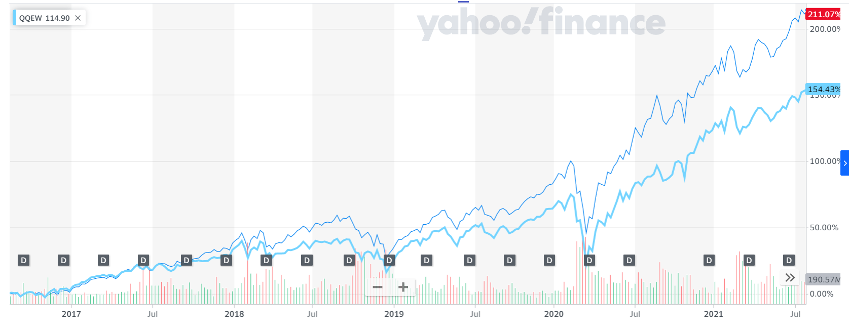 QQQ ETF와 수익률을 비교해보면, 최근 기술 섹터 주식이 강세라서, QQEW ETF 수익률보다 60% 이상 높습니다. 시가 총액 상위 기업들의 수익률에서 차이를 만든 것 같습니다. 그래프를 보시면, QQQ와 거의 동일하게 움직입니다.