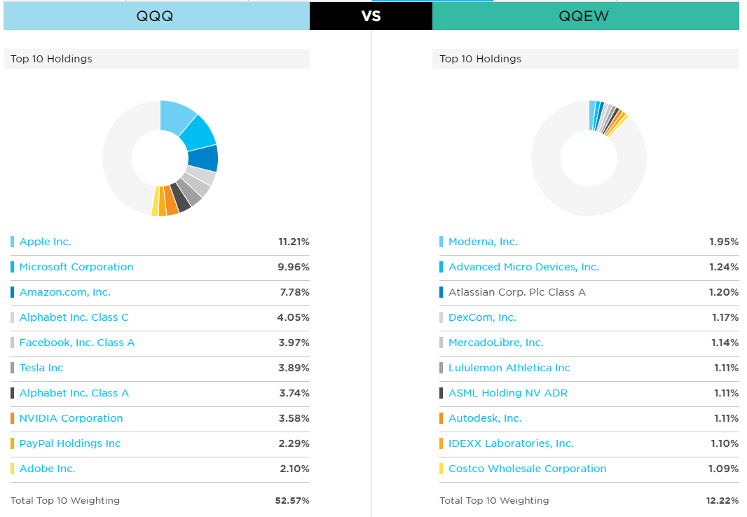 보유 종목 경우 상위 비중 종목이 다릅니다. QQQ경우 시가 총액이 큰 기업 순으로 투자되어 있고 QQEW ETF는 동일하게 1~2% 사이로 고르게 투자되어 있습니다. 그래도 기업별로 조금씩 비중이 차이 나는 것은 리벨런싱 이후 주가가 상승해입니다. 다음 리벨런싱을 하게 되면 다시 고른 비중으로 조정됩니다.