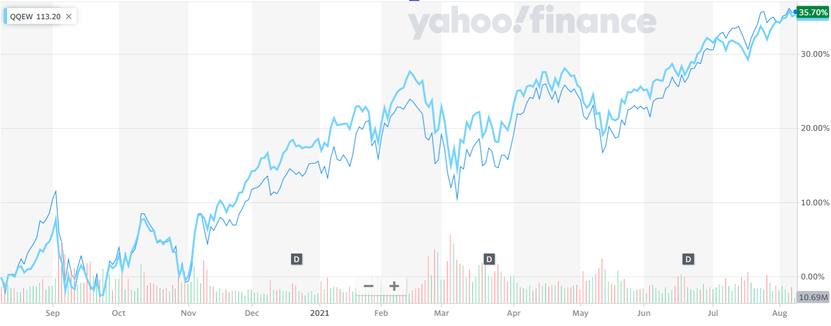 먼저 보신 그래프는 5년 누적 수익률 그래프라서 수익률 차이가 커 보이지만, 최근 1년 수익률 그래프를 보시면, QQEW가 QQQ 수익률을 넘어서는 순간들을 볼 수 있습니다.
