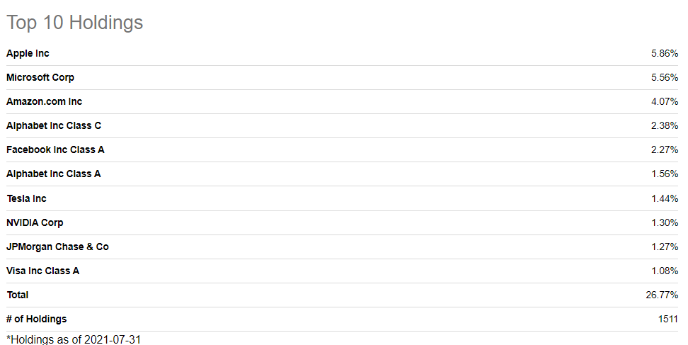 보유 비중 TOP10 기업으로는 너무나 유명한 애플, 마이크로소프트, 구글, 페이스북, 테슬라, 엔비디아, JP모건 같은 기업의 주식이 모두 포함되어 있습니다. ESGV ETF는 총 1511개 기업에 투자하고 있어 분산투자 효과가 있습니다.