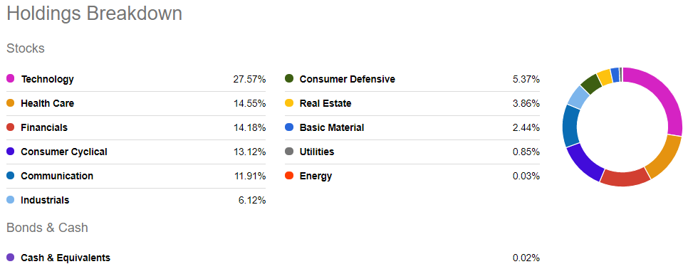 ESGV ETF 보유 섹터로는 기술, 헬스케어, 금융, 순환 소비재, 커뮤니케이션 순이며, 이 섹터들 합계가 80% 넘습니다. 요즘 ESG가 이슈화가 되며, 대중과 친숙한 이 섹터에 속한 많은 기업들이 ESG 활동에 노력하고 있어 비중이 놓은 것 같습니다.