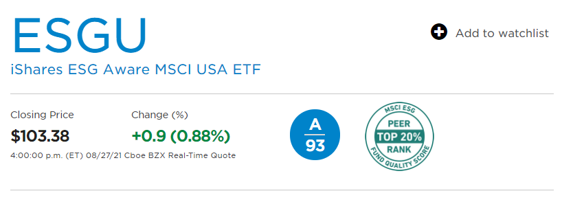 미국 ESGU ETF는 티커명으로 정식 명칭은 iShares ESG Aware MSCI USA ETF입니다. 자산 운용사는 블랙록으로 iShares는 블랙록에서 운영하는 ETF 브랜드명입니다. MSCI USA Extended ESG Focus라는 지수를 추종하며, 이곳에 속한 미국 ESG 기업에 투자합니다.