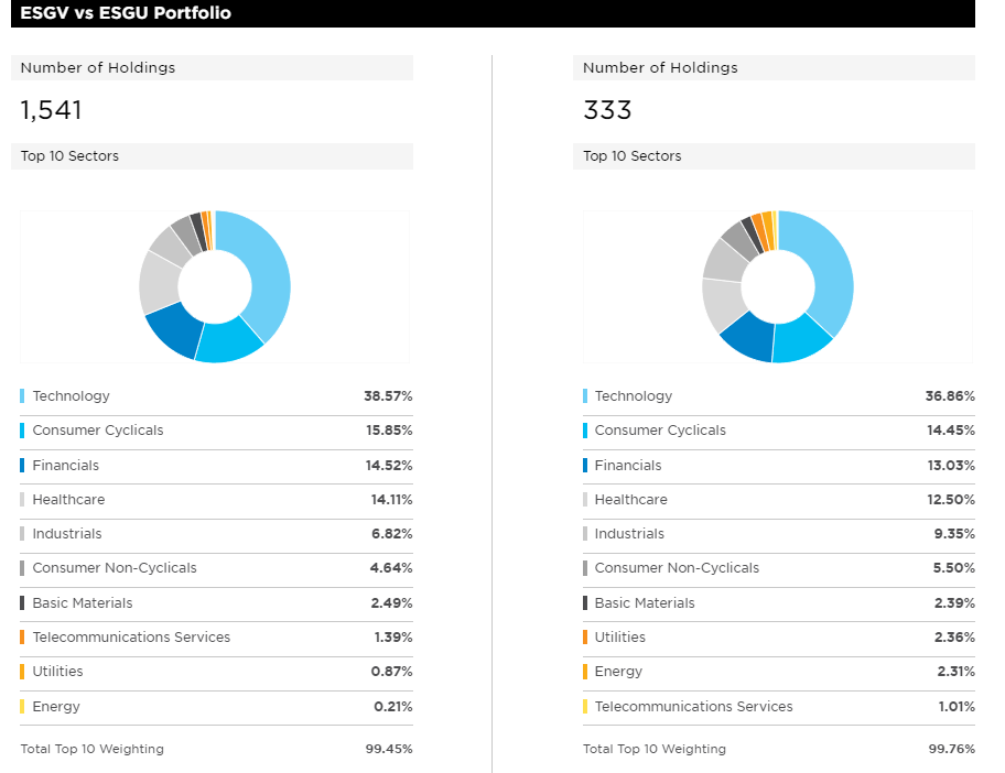 미국 ETF ESGV와 ESGU 섹터 및 보유 주식 비교